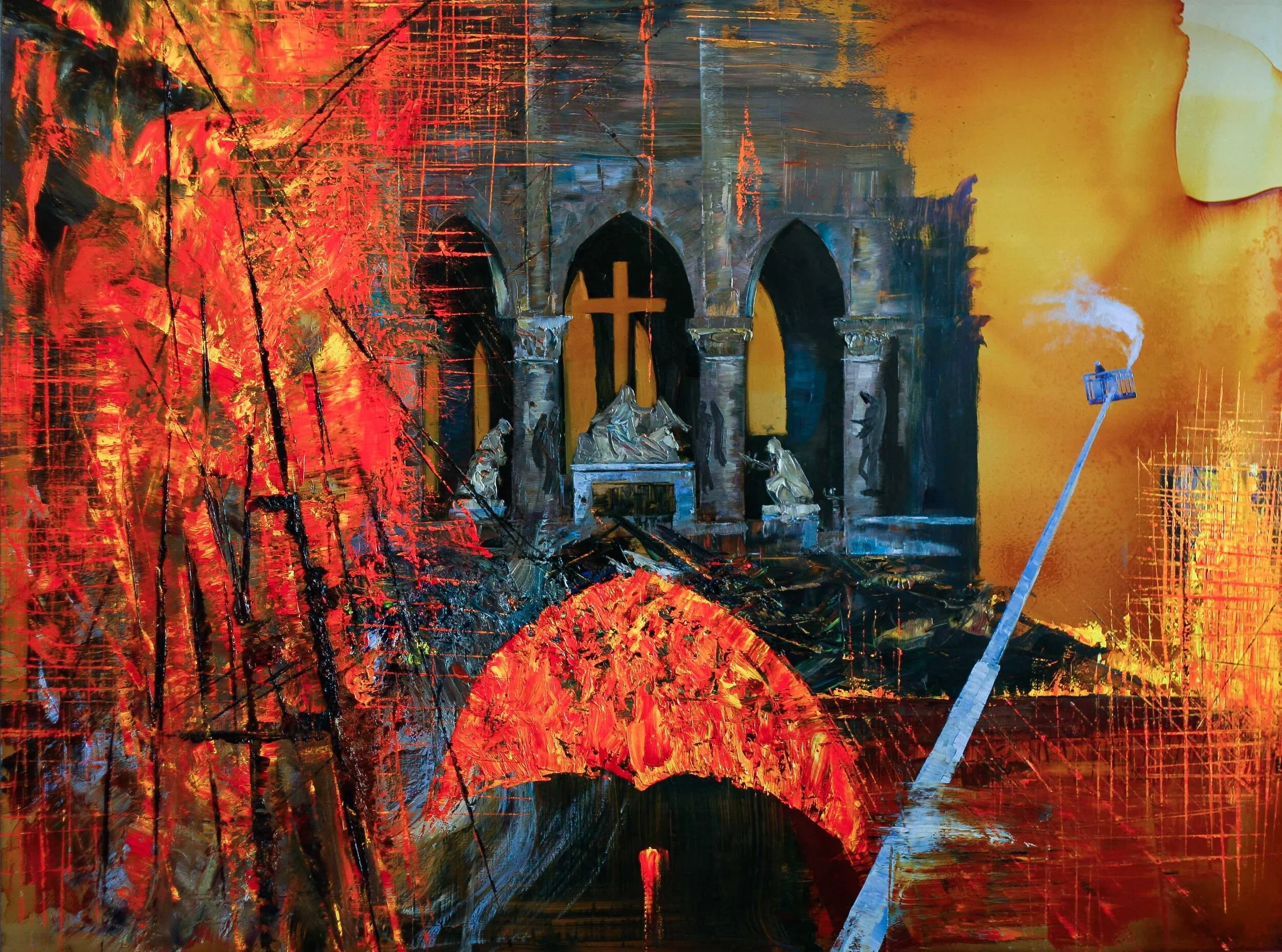 Eurooppa tulessa kuvaa liekehtivin värein Notre Damen katedraalin tulipaloa, Ranskaa ja Eurooppaa vavisuttanutta, syvästi symbolista tapahtumaa, josta itsekin olen kirjoittanut. Kaiken nielevän tuhon ja tyhjyyden keskellä tuntuu kipinä löytyvän hengen voimasta ja perinteestä. Rukous-teoksessa valo loistaa pimeyden halki katedraalin alttarille, jota kohti ajelehtivat kolminaisuudesta muistuttavat sininen, keltainen ja punainen ilmapallo. Tummaa avaruutta vasten huojuva, sini-vihreänä hehkuva Maailmanpuu antaa lupauksen elämästä.